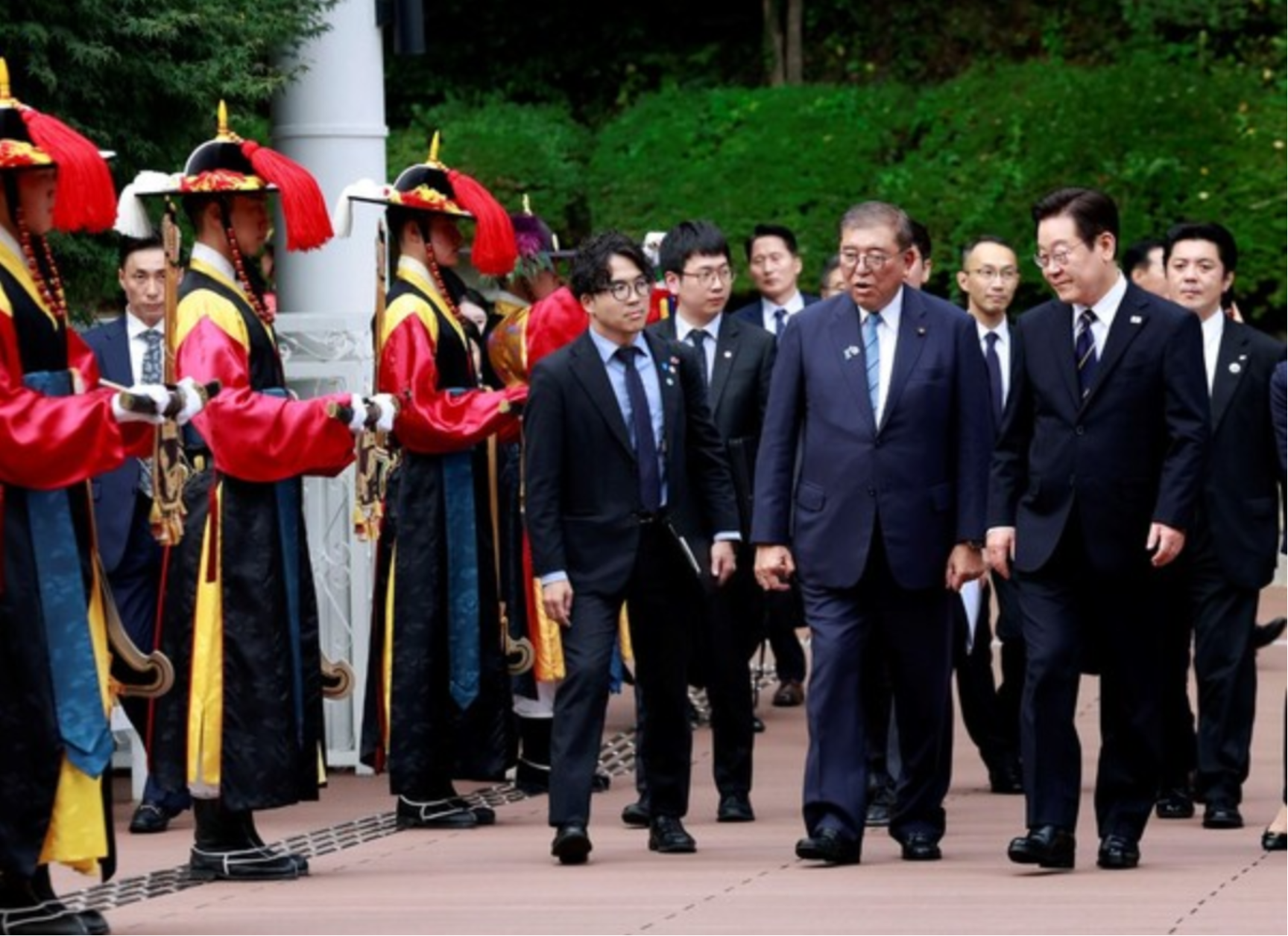 이시바 총리는 이번에 실무방문 형식으로 한국을 찾았다. 그러나 한국 정부는 국빈방문에 준하게 예우하기 위해 이시바 총리가 누리마루에 입장할 때 전통 의장대와 군악대 도열로 그를 맞았다. 대통령실은 조선 시대 일본으로 보낸 외교 사절단인 조선통신사 행렬을 재현했다고 설명했다.