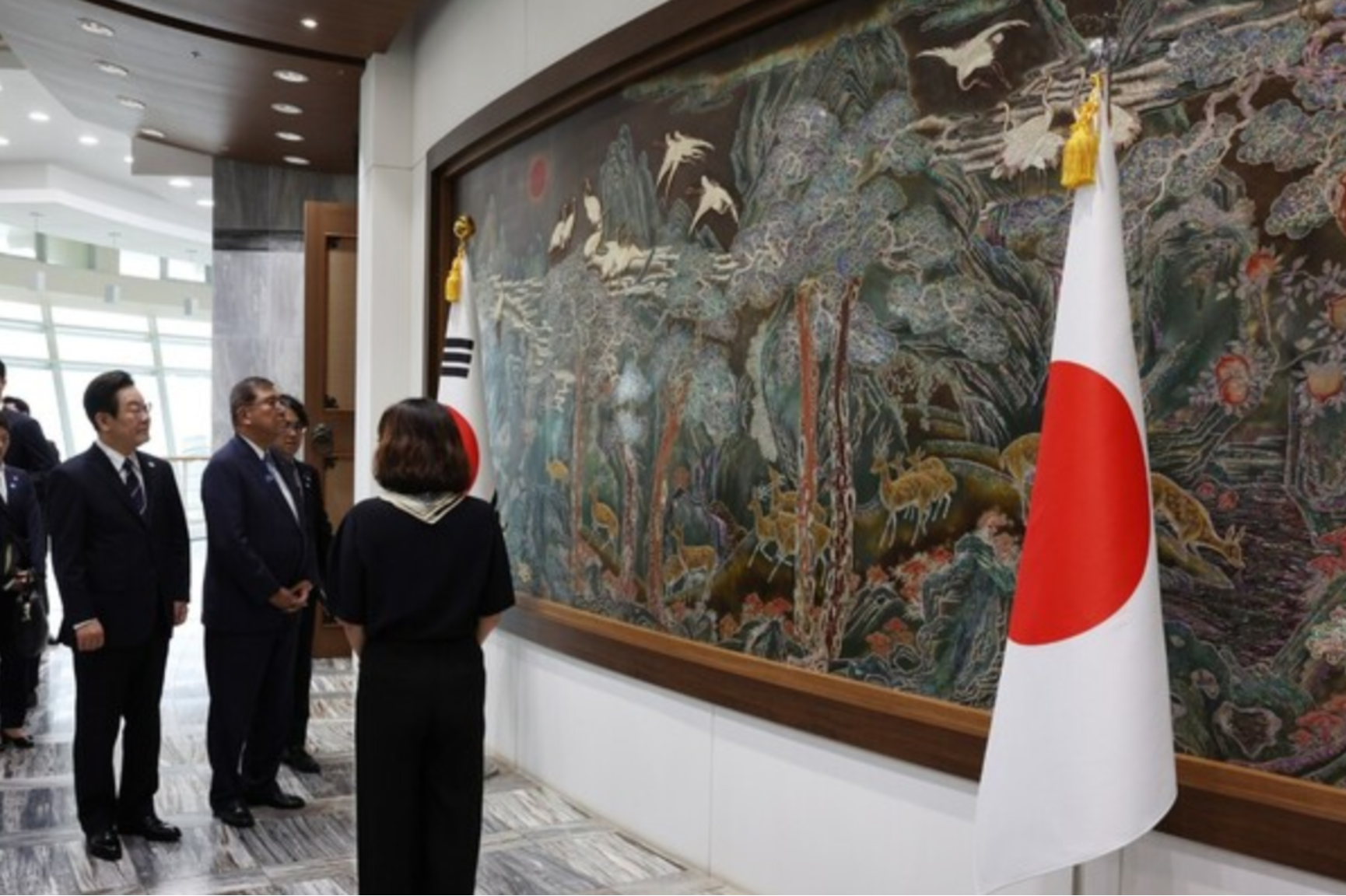 이재명 대통령과 이시바 시게루 일본 총리가 30일 부산 해운대구 누리마루 APEC하우스에서 한일 정상회담에 앞서 누리마루 내부에 걸린 그림을 보고 있다. 대통령실사진기자단