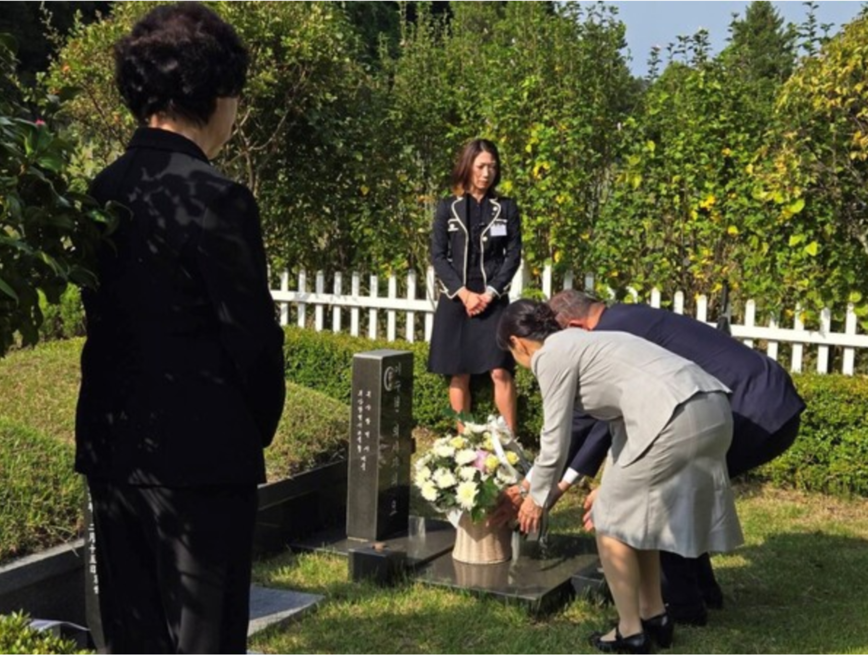 이시바 시게루 일본 총리와 부인 요시코 여사가 30일 부산 금정구 영락공원 내 고 이수현 씨 묘를 참배하고 있다. 이 씨는 2001년 도쿄 신오쿠보역 선로에 떨어진 일본인을 구하려다가 목숨을 잃었다. 이시바 시게루 X 캡처