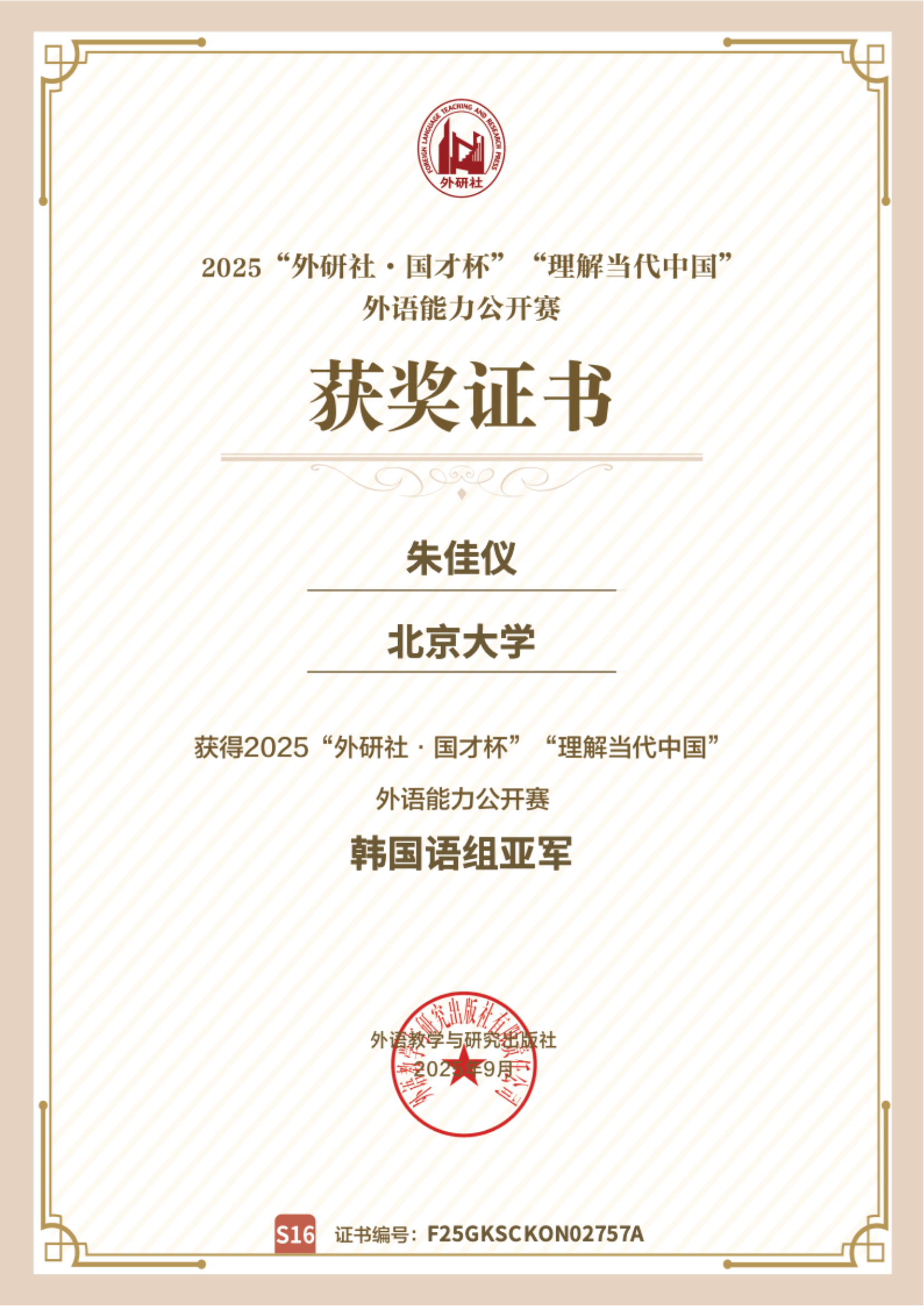 주가의는 대회에서 훌륭한 언어 실력과 ‘오늘의 중국’이라는 주제에 대한 깊은 이해를 바탕으로 수많은 참가자 가운데 두각을 나타내며 한국어 부문의 준우승을 차지함으로써, 우리 학과 학생들의 우수한 전문 지식과 종합 능력을 보여주었다. 우리 학과 학생들이 앞으로도 학업과 각종 대회에서 끊임없이 탁월함을 추구하며, 언어를 가교로 삼아 중국의 목소리를 세계에 전하고 좋은 성과를 거두기를 기대한다.
