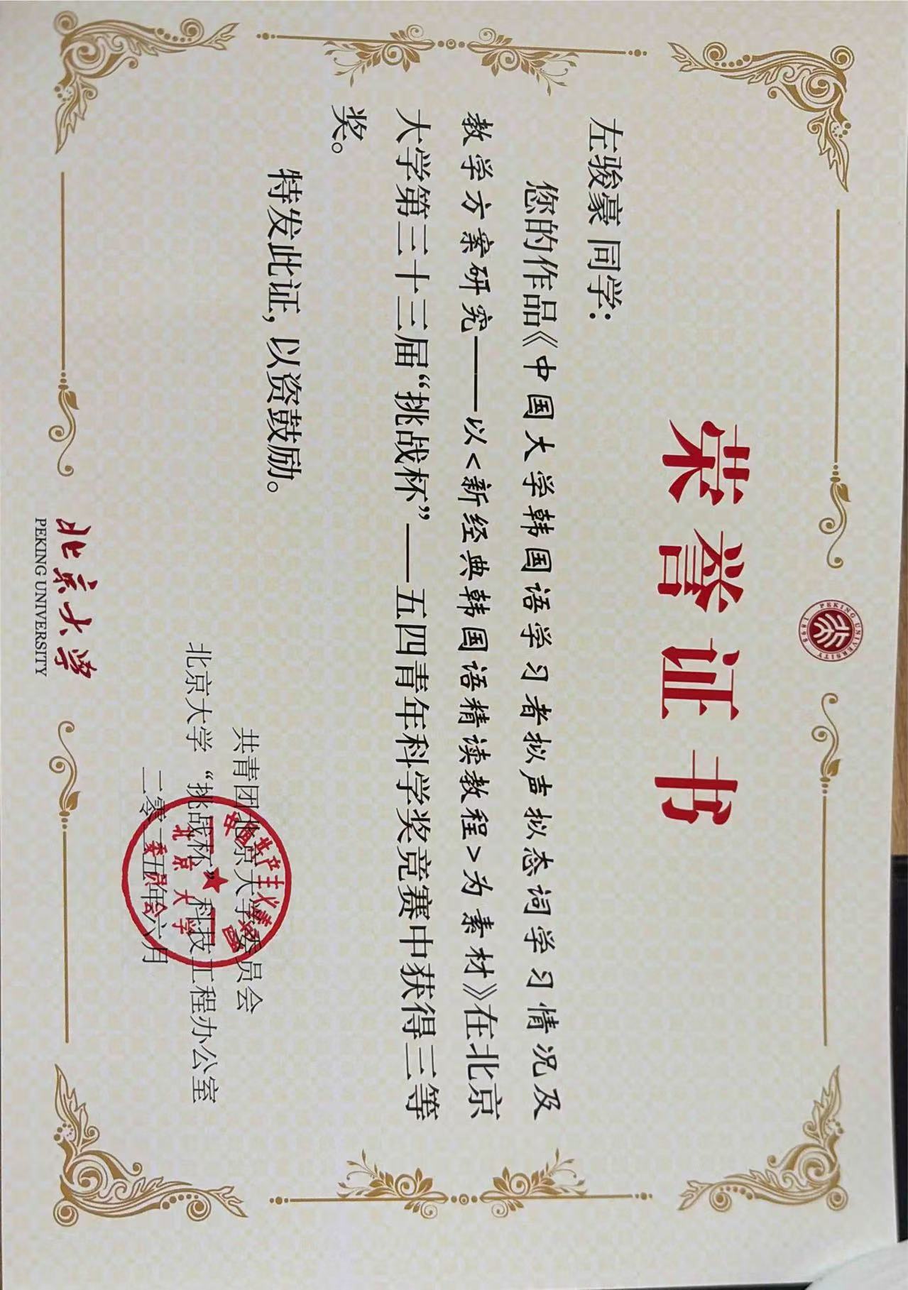 我系2024级研究生徐瑞佳撰写的《基于情动的记忆建构:韩江小说中的创伤书写与疗愈可能》(指导教师:文丽华老师)、2022级本科生左骏豪撰写的《中国大学韩国语学习者拟声拟态词学习情况及教学方案研究——以<新经典韩国语精读教程>为素材》(指导教师:丁一老师)凭借严谨的逻辑与论证,双双荣获五四青年科学竞赛奖三等奖。