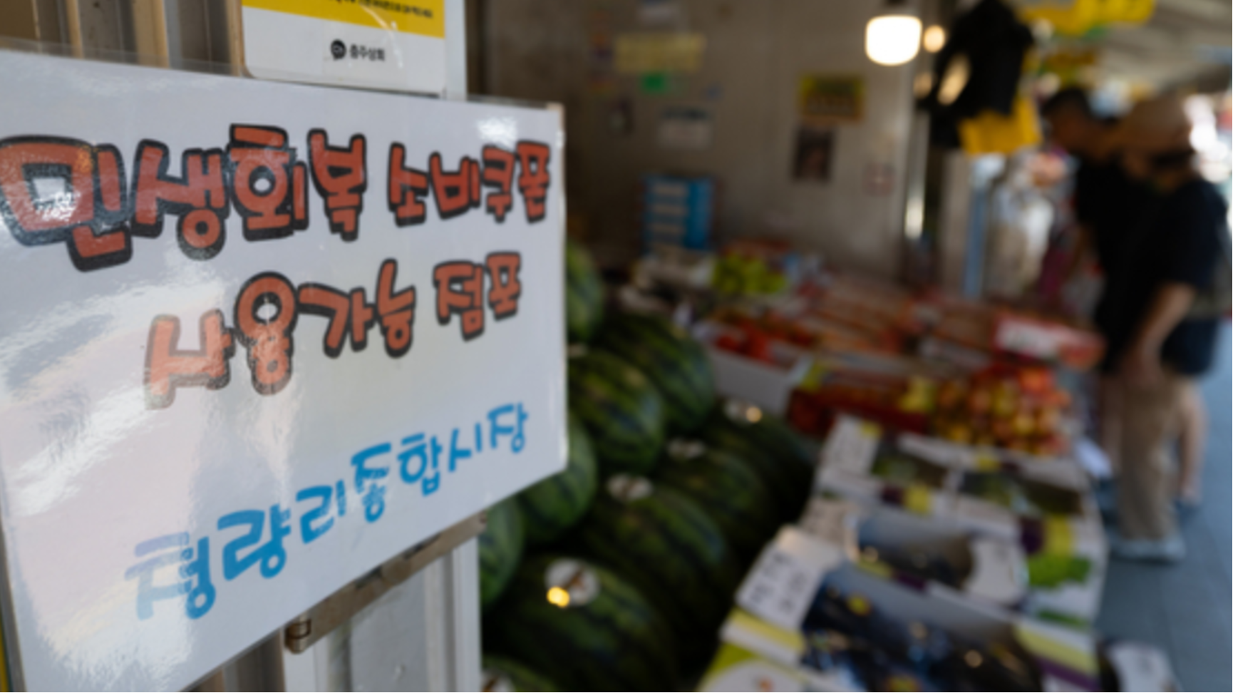 图为8月10日,首尔市内一家传统市场张贴出可使用民生恢复消费券的公告。【照片来源:NEWS1】